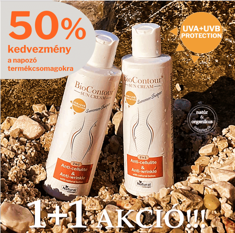 - 2 db „Nyári karcsúság” 2in1 narancsbőr elleni & ránctalanító hatású napozó krém 30 SPF UVA+UVB fényvédelemmel 200 ml – Termékleírást ITT találhatod!